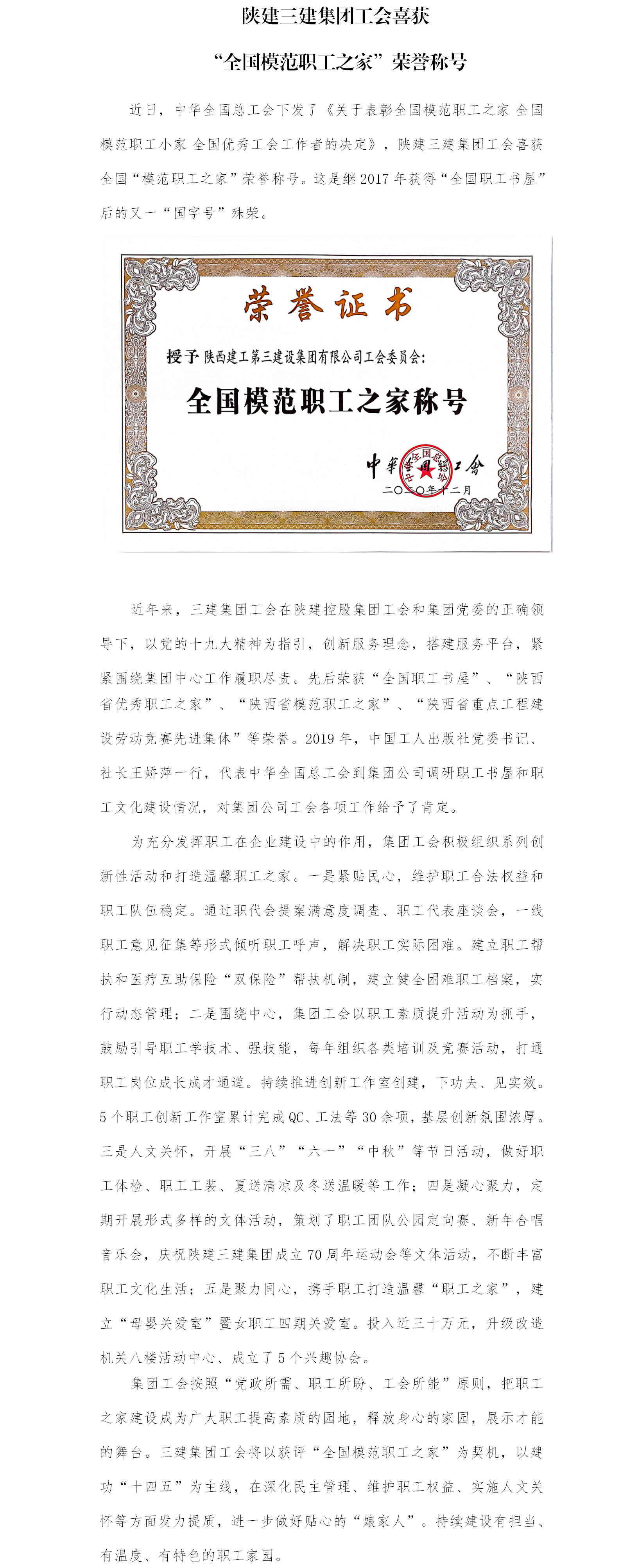 陜建三建集團工會喜獲“全國模范職工之家”榮譽稱號